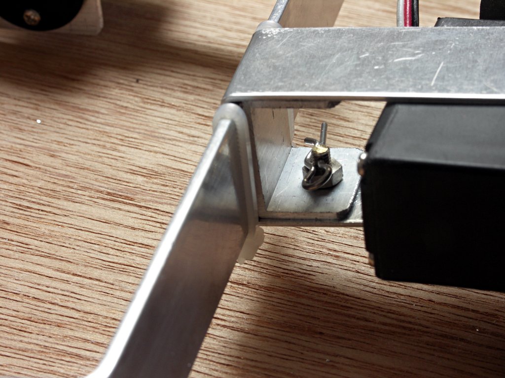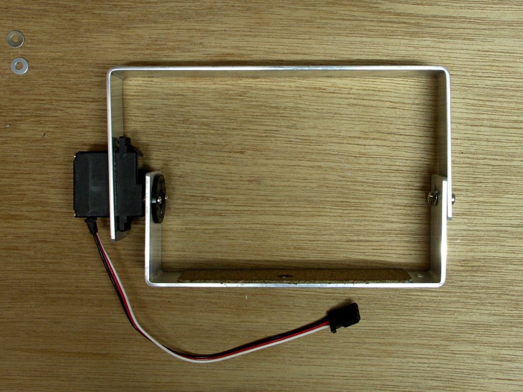 Now assemble the UU frame Cut drill and pin a 3 mm bolt fit as shown adding washers to taste. Don't forget to screw the horn to the tilt servo.
