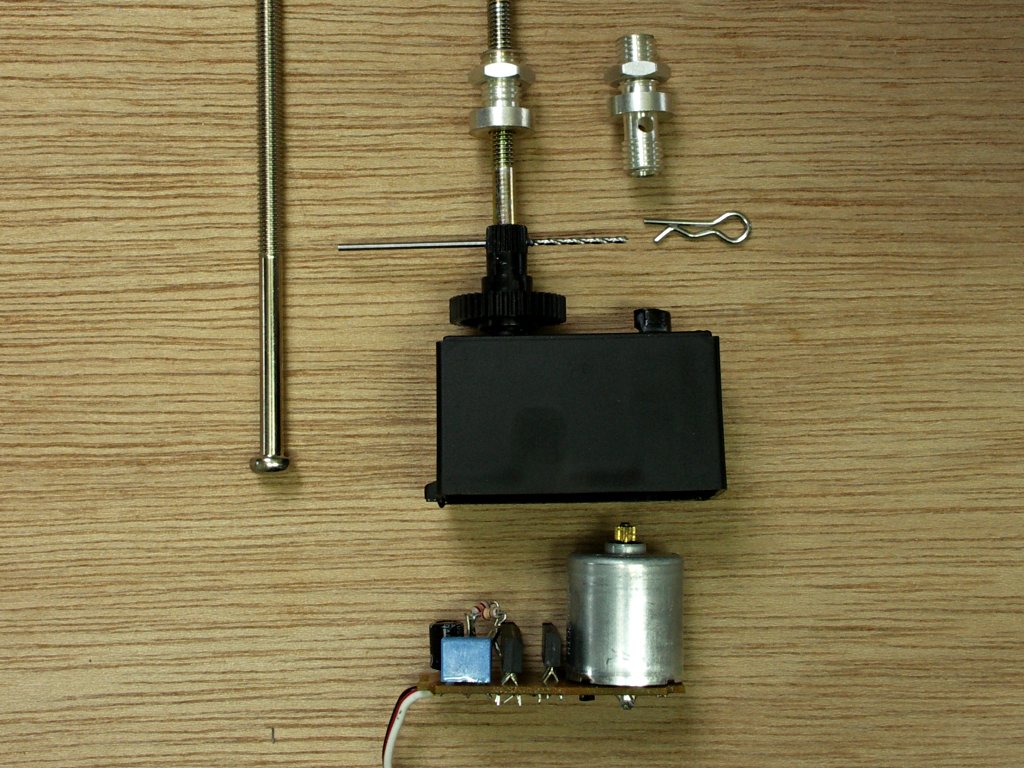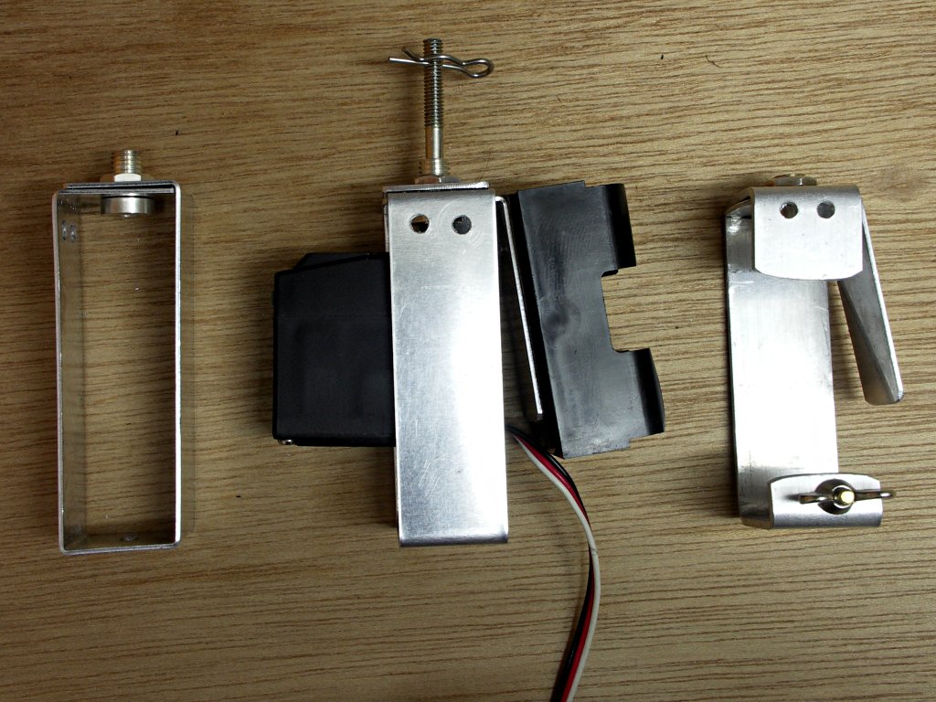 I have used a Futaba s3101 servo. But there are many alternatives. However you must 2 mm x 20 aluminium for the upper U as it is to fit inside the collar chassis.
