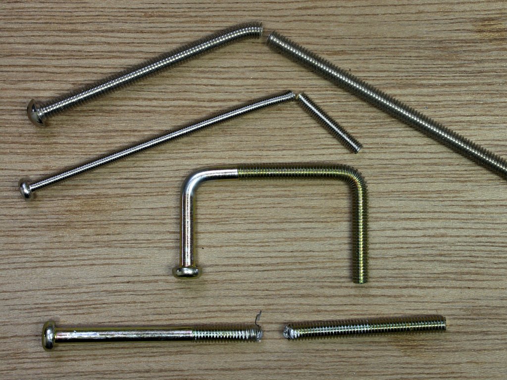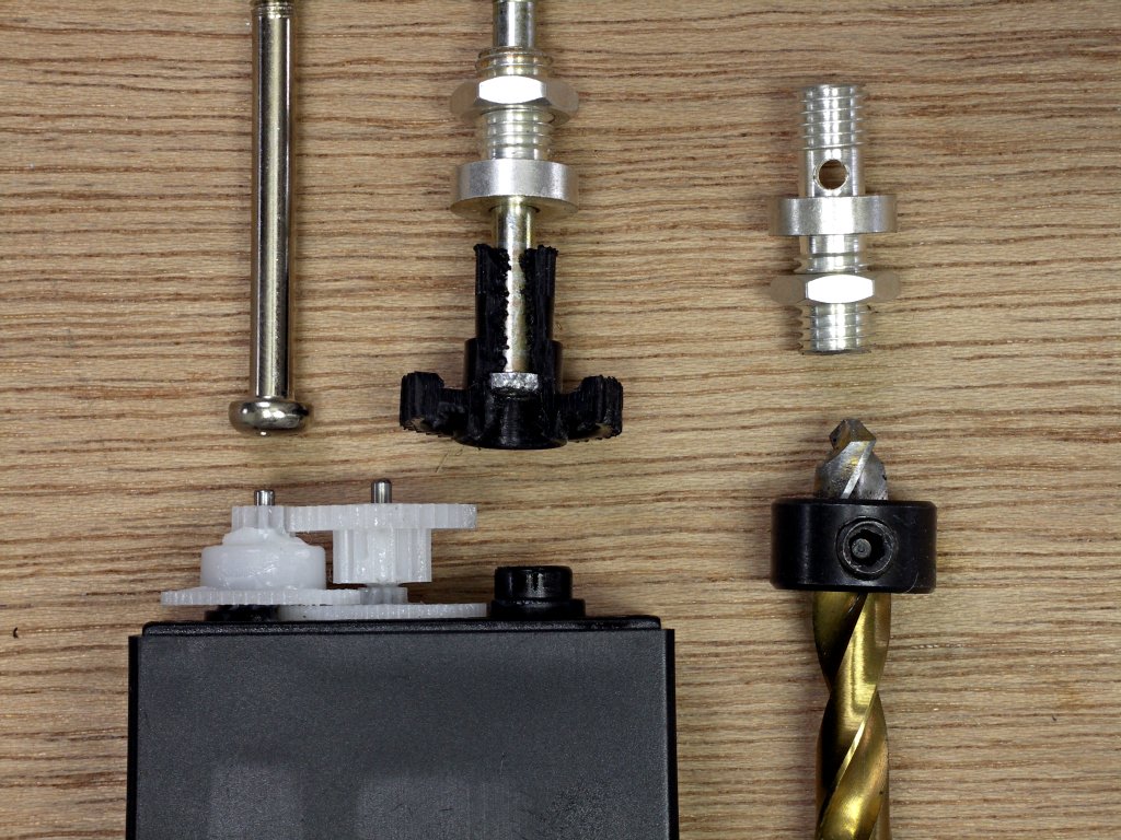 3 The central bolt which passes through last gear of the pan servo and then up through the collar is 6 cm long and 4 mm in diameter. It must be part threaded for much of its length and and better still completely unthreaded. Threads are weak points inviting fracture. Before using a bolt take another from the same batch, put it in a vice and attack it with a hammer. If it is brittle and won't bend at least 90º don't use it. When bolts are bent imperceptible fractures traverse them so never attempt to straighten them - always replace.
