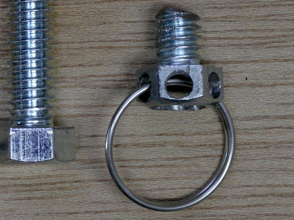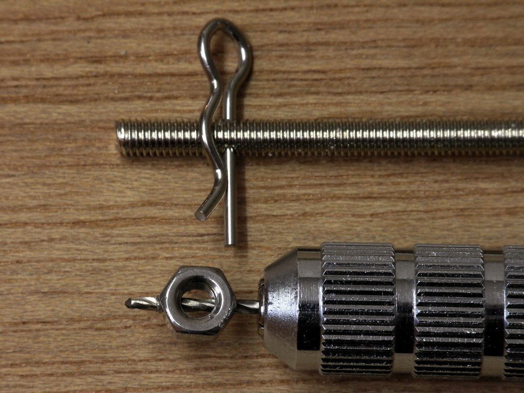 4 You will need to make tiny holes to put R pins through both 3 mm and 4 mm bolts. First invest some time in making a guide. An convenient thing to use is one of the nuts which comes with them. Make your mistakes on them and when successful get it insured. The picture above shows a 1.1 mm hole in a 3 mm bolt.