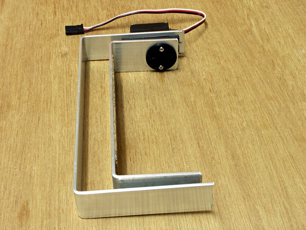 3 Work out how deep you want the upper frame and bend so that you have the first right angle. You can now fit the servo. The grommet will be a problem as the cutout doesn't allow for it. Use a small file and provide it the minimum assistance required.