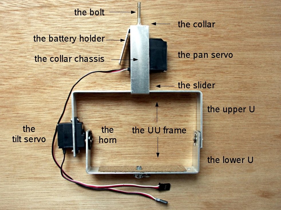 1 Slide the UU frame until your camera is horizontal. There is a 3 mm hole at the bottom of the collar chassis. Put a mark on the underside of the upper U. Now drill a hole and fit a bolt and nut and make secure with an R pin.